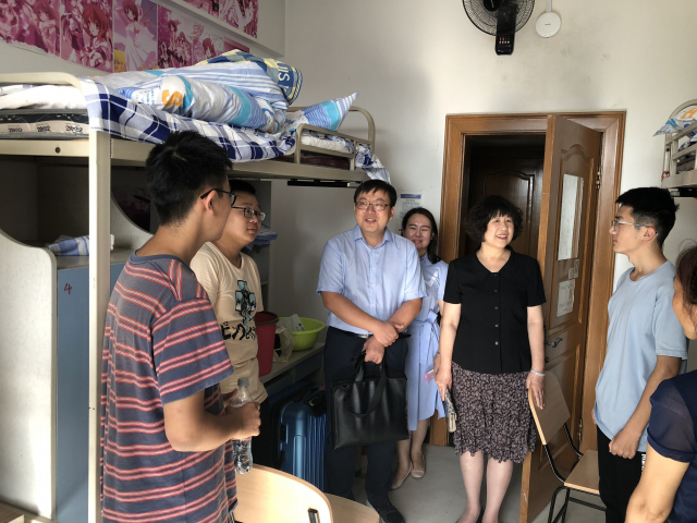 在B03和B07公寓,齐晶瑶一行看望正在寝室休息的新生及家长,查看了寝室设施,询问了新生的基本情况,与家长作了简短的交流,叮嘱辅导员要对单独报到的新生予以更多关心。