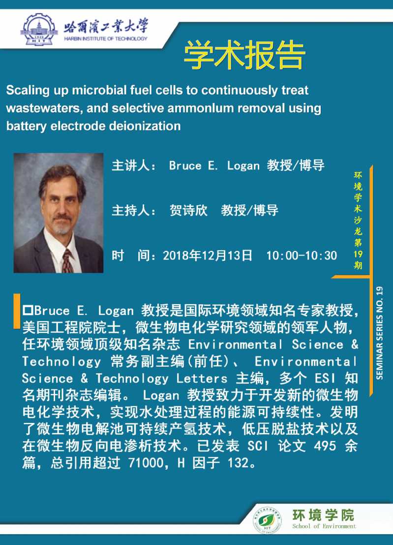 应贺诗欣教授的邀请,美国工程院院士Bruce E. Logan教授将于2018年12月13日访问pc28平台门户网站 并进行学术交流,欢迎全校感兴趣的师生参加。学术讲座信息如下: