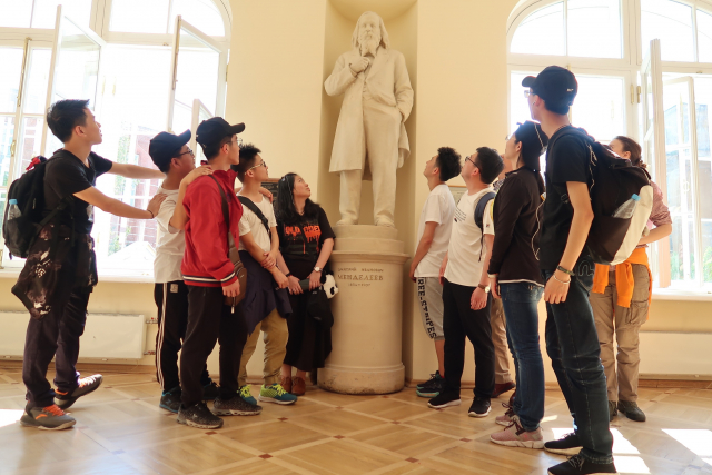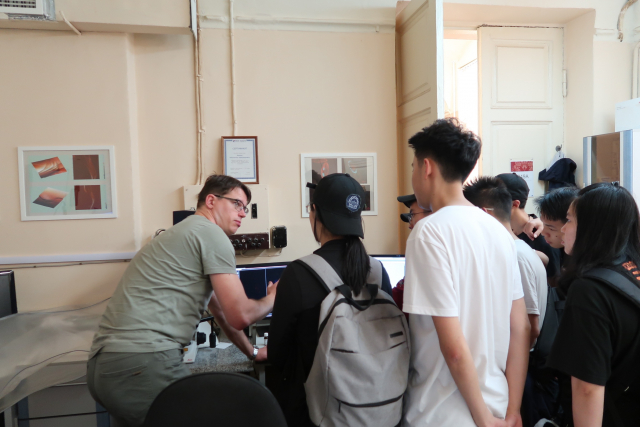 设备参观学习之后,来自圣彼得堡大学的学生Anna带领我们参观主楼充满历史文化气息的长廊。从这里,曾走出了欧拉、罗蒙诺索夫、门捷列夫、巴甫洛夫、切比雪夫、布尼亚科夫斯基、楞次等优秀人物。而在这长廊之中,陈列着这些人物的雕塑、画像以及事迹板,同学们在参观学习中,近距离感受了圣彼得堡优秀人物的历史气息,同时也惊叹圣彼得堡大学的历史文化气息浓厚,每个人都获益匪浅。