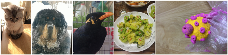 图片1:程艳辉老师_猫咪晒太阳,愿春暖花开,疫情早日结束;图片2:冯玉杰老师_人类最执着的朋友;图片3:魏健老师_可爱的八哥;图片4:杨月老师_晒厨艺;图片5:王晶老师_新冠,消灭你们!