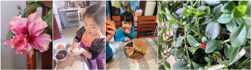 图片1:连洋老师_春暖花开时;图片2:杨月老师_跟妈妈一起做点心;图片3:刘博老师_给女儿做的蛋糕;图片4:王晶老师_接纳当下,朝向更好的下一刻努力。