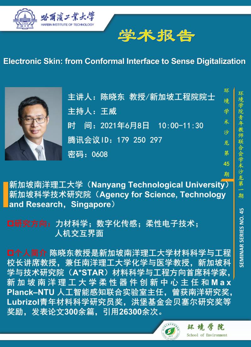 新加坡工程院院士,新加坡南洋理工大学(Nanyang Technological University)教授,新加坡科学与技术研究院(A*STAR)材料领域首席科学家陈晓东将于2021年6月8日与哈尔滨工业大学师生进行学术交流,欢迎感兴趣的师生参加。