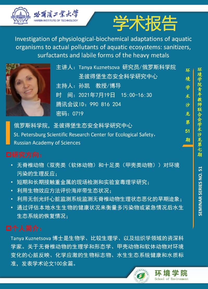 俄罗斯科学院,圣彼得堡生态安全科学研究中心Tanya Kuznetsova研究员将于2021年7月19日与哈尔滨工业大学师生进行学术交流,欢迎感兴趣的师生参加线上学术报告会。