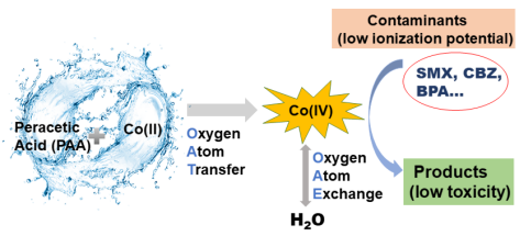 钴基类芬顿体系是一种前景很好的高级氧化技术,被广泛应用于处理难降解有机污染物。该过程的主要氧化机制一直被认为是通过单电子转移产生各类自由基来完成的。郭婉茜教授团队在通过钴活化过硫酸盐体系的氧化机制进行再次探索时,意外地发现了高价钴氧化物种(Co(IV))的存在,并在酸性条件下起主导作用,这一发现打破了对钴基类芬顿过程的传统认识。受此启发,郭婉茜教授团队将该机制进一步推广到钴活化过氧乙酸体系。研究结果表明,类似与钴活化过一硫酸盐过程,该机制在过氧乙酸体系中依旧存在。在酸性条件下,二价钴可以与过氧乙酸发生双电子转移反应(氧原子转移),产生Co(IV)。由于Co(IV)的强氧化性和选择性,钴基过氧乙酸体系可以高效地氧化具有富电子基团地有机污染物(如卡马西平、双酚A和各种磺胺类抗生素等),而且对环境中存在的无机干扰离子和腐殖酸表现出了一定的抗性。相关研究深化了对钴基类芬顿体系的认识,推动难降解废水处理理论的革新和发展。