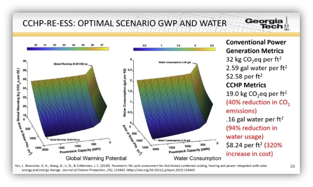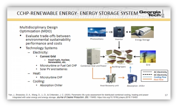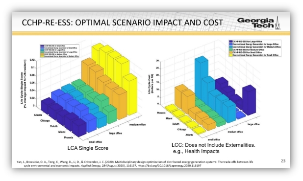 Crittenden教授展示了一种典型的分散式的新能源供给方案,集成了冷热电联产、光伏发电和电池能量储存系统。该案例来源于美国亚特兰大的一幢办公大楼,该大楼的供能方案设计先进,基于多技术耦合集成优化设计理念,既配有传统的电网供电系统,也有新建冷热电三联系统,甚至是配套的光伏发电系统与电池储能系统。故而,该建筑的电力供给包括电网供电、光伏发电供电、电池供电、微型涡轮机供电多条路径,热量供给来源为微型涡轮机供暖,冷气供给来源为吸收式制冷机。通过对比该办公楼增建冷热电三联系统与新能源系统前后对传统电网供电的依赖程度,研究人员拟使用参量全生命周期评估法(Parametric LCA)对该系统的能源经济效益和环境价值进行全面评估。