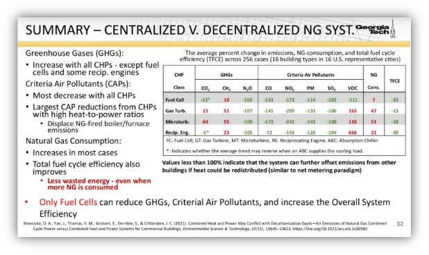 Crittenden教授团队评估了美国16个代表性的城市中16种建筑类型中256个示例的能源系统,其中包含每栋楼8760个小时,21个CHP系统,2个制冷系统以及3 种场景下共101百万个数据采集点。通过其研发的能量平衡模型量化了温室气体(GHG)排放量、常规空气污染物排放(CAP)和天然气(NG)消耗量。结果表明,在大多数情况下,与集中式NGCC系统相比,分散式热电联产系统增加了温室气体排放,减少了CAP排放,以及减少了天然气消耗。而只有燃料电池CHP能够同时减少GHG、CAP和NG消耗,并提高整个系统的效率。