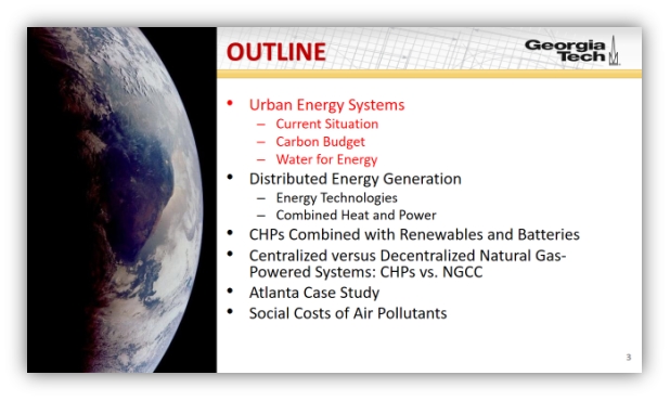 John C. Crittenden教授以《应用分散式能源系统减少空气污染、水污染以及温室气体排放》为题阐述了分散式能源系统应用前景及其对全球气候影响的内在逻辑关系。报告从城市能源系统、分散式能源系统、冷热电联产与可再生能源及燃料电池的结合、集中式与分散式天然气系统的比较、亚特兰大实际案例分析以及空气污染的社会成本六个方面展开讲述。