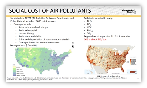 John C. Crittenden教授使用空气污染排放实验结合制定的 DES 和 CCEP排放税政策模型对空气污染物排放的社会成本进行量化。 展示了NH3、NOX、VOC、PM2.5以及SO2排放可造成的社会成本。结果表明,集中式常规能源生产的社会成本明显高于分散式能源系统。假设与能源相关的排放所产生的社会成本也被考虑作为能源生产的排放税征收,与CCEP 相比,分散式能源系统的建筑能源供应方案将变得具有成本竞争力。