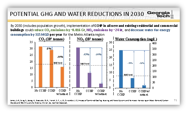 基于此研究结果,Crittenden教授还预测了2030年的温室气体排放及能耗情况,到2030年(包括人口增长),在所有新建和现有住宅和商业建筑中实施冷热电联产可减少约0.016 Gt的二氧化碳排放量,约24 kt的氮氧化物排放量,并减少亚特兰大大都会地区每年水换能源315 MGD的消费量。