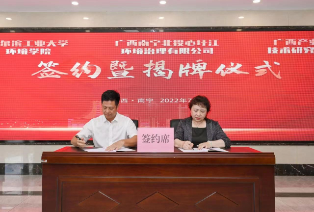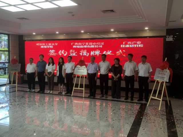 广西南宁北投心圩江环境治理有限公司副董事长毛志刚与院长冯玉杰签订了合作协议,曾庆生书记与唐亮东书记、毛志刚副董事长与冯玉杰院长、谭福副部长与刘国宏助理研究员分别为“水环境综合治理创新中心”、“水环境工程技术中心”和“校企联合培养实践基地”揭牌。