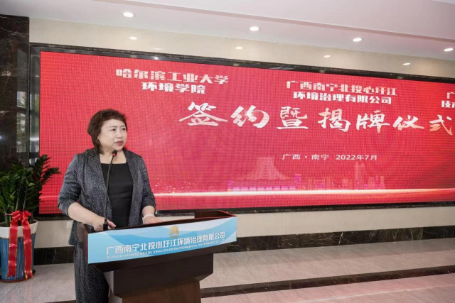 签约仪式由广西南宁北投心圩江环境治理有限公司总经理李晓强主持,冯玉杰院长和北投集团党委副书记(董事)曾庆生分别致辞。冯玉杰在致辞中回顾了心圩江项目建设工程中哈工大院士团队与心圩江公司一起为心圩江修复工程成功所做的努力和合作经历。她表示在未来将通过学院人才优势和技术优势,依托广西南宁北投心圩江环境治理有限公司广阔的市场空间,开展更多的环境领域技术合作项目,实现科技赋能、人才培养与成果转化。北投集团领导曾庆生向pc28平台门户网站 的大力支持表示了感谢,并代表公司表态会借助生态文明建设和环保产业大发展的东风,着眼“人才培养”这一根本任务,将借助合作平台开展系列环境领域工程建设。