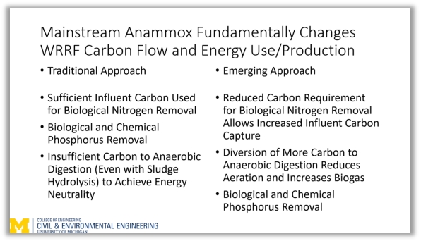 Glen教授还介绍了传统污水处理厂中所发现的厌氧氨氧化过程。他指出,要实现短程脱氮及厌氧氨氧化脱氮过程,并削减氧气用量,碳源分离是必须的。因为当进水中含有有机物时,那么反硝化过程就会依赖于异养反硝化,此时耗氧量无疑会有所增加。而主流厌氧氨氧化理论上改变了碳足迹同时改善了能量的利用。在传统污水处理中,进水中需含有足量的有机碳源以实现生物脱氮;磷的去除依赖于生物与化学过程;未被利用的碳源进入厌氧消化池以期望实现能量中和。在未来的污水处理中,生物脱氮过程减少了对碳源的依赖,因此进水碳源可尽可能多地被捕集;提高碳捕集率可以减少曝气能耗,同时增加沼气的产量。