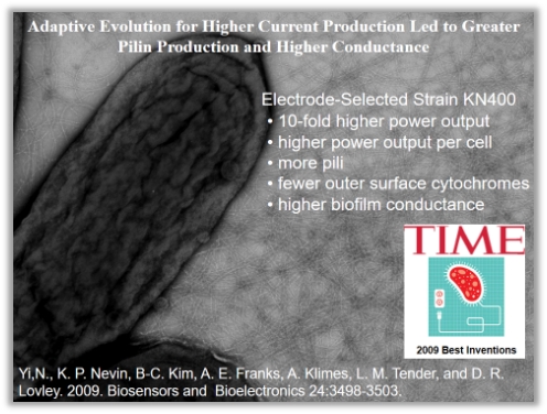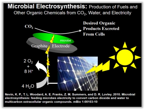 在微生物吸电子方面,Derek Lovley教授实验室发现,Geobacter可以电极为唯一电子供体还原电子受体,这一过程还可能被应用于实际受UI(VI)污染的场地修复,另一个可能的应用为微生物电合成过程,即微生物可以还原二氧化碳并合成有机物。Lovley教授实验室通过合成ACL突变株,实现了Geobacter sulfurreducens以电极为电子供体,以富马酸为电子受体生长的过程,进一步证实了Geobacter从电极得电子的能力。