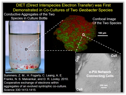 随后,Derek Lovley教授实验室首次发现并证实了种间直接电子传递(DIET)现象,开创了又一个新的研究领域及热潮。当将两株不同种的Geobacter进行共培养时,研究者惊喜地发现电子供体与电子受体都被消耗,同时形成了非常明显的聚集体。进一步的实验证明Geobacter metalireducens产生导电Pili与Geobacter sulfurreducens形成种间直接电子传递,而Geobacter metalireducens的突变株Aro-5(Pili不导电)却无法与Geobacter sulfurreducens形成聚集体进行互营生长。