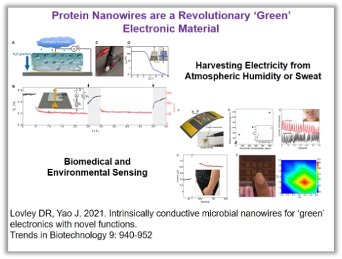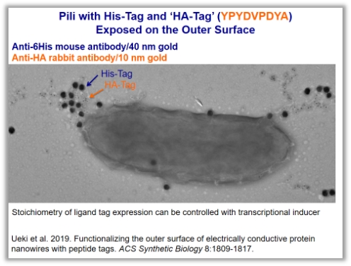 Geobacter表达的纳米线另一个十分重要的应用是,依赖其导电特性,合成各种电子元件,例如传感器、利用空气湿度的发电器、可穿戴电子设备等等,这些可能的应用都让人们为之兴奋。Derek Lovley教授实验室利用HA-Tag以及His-Tag的方式证明Pili在胞外的分布,并且这些标记方法并未影响pili的导电性。由于Geobacter对生长条件要求较苛刻,因此,Lovley教授实验室通过合成生物学的方法,实现了产生pili的E. coli菌株构建,并成功发明了针对痕量氨氮的电子传感器。