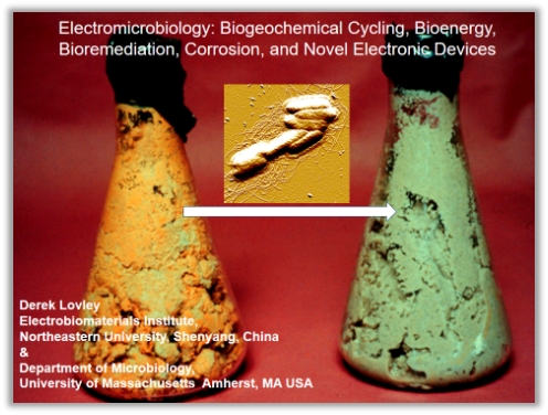 电活性菌还原铁氧化物生成磁铁矿,这一过程在铁地球化学循环中发挥着重要作用,这也表明铁还原菌是十分独特且古老的。电活性菌广泛存在的另外一个场景是受苯系物等污染的地下环境,早期的DGGE研究也表明Geobacter是这些环境中的优势菌。此外,Geobacter还可以还原U(VI),完成受污染土壤的修复。Derek Lovley教授还介绍到一些极度嗜热菌也体现出还原铁氧化物的能力,证明其可进行胞外电子传递。