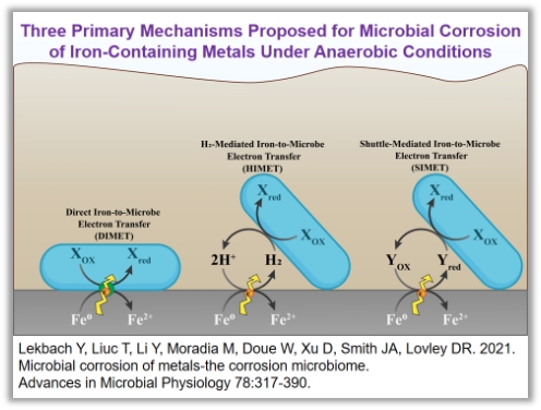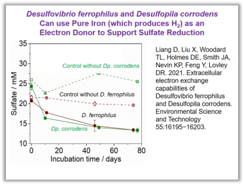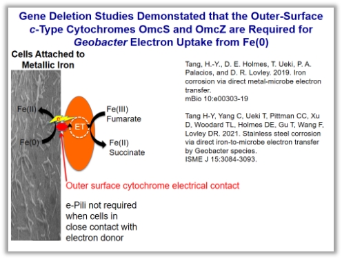 Lovley教授实验室通过分子生物学手段获得了不能够利用氢气的G. sulfurreducens的突变株,发现其仍可利用Fe(0)为电子供体,进一步的实验证明OmcZ以及OmcS在得电子过程中发挥重要作用。Methanosarcina acetivorans也可以进行铁腐蚀,基因组学研究发现外膜细胞色素MmcA在该过程中发挥着重要作用。当用Fe(0)为电子供体时,无法避免地产生氢气,而当用不锈钢代替Fe(0)作为电子供体时,可避免氢气的自发产生,于是,通过以不锈钢作为电子供体,探讨了两株硫酸盐还原菌是否可依赖直接电子传递的方式进行生长,结果发现仅当以Fe(0)为电子供体并且有氢气产生时,硫酸盐还原才发生,而在以不锈钢为电子供体的体系中,硫酸盐浓度并未降低。这一结果也说明,在确定金属腐蚀是否由直接电子传递过程造成时,严格除去氢气的影响十分关键。