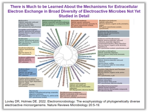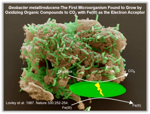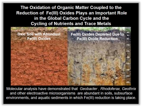 电活性菌氧化有机物同时还原铁氧化物是自然界中微生物胞外电子传递的重要表现形式。该过程在土壤或沉积物中十分常见,因为在这些环境中含有大量的铁氧化物,通过土壤层颜色的变化可以清晰地看到这一过程的发生。这一过程在较深层的环境中也发挥着重要作用,例如地表数百米以下的地下水环境中,也发现大量电活性菌的存在。此外,电活性菌还参与多种环境碳循环,并与一些微量元素、营养物质的释放等息息相关。