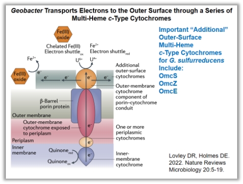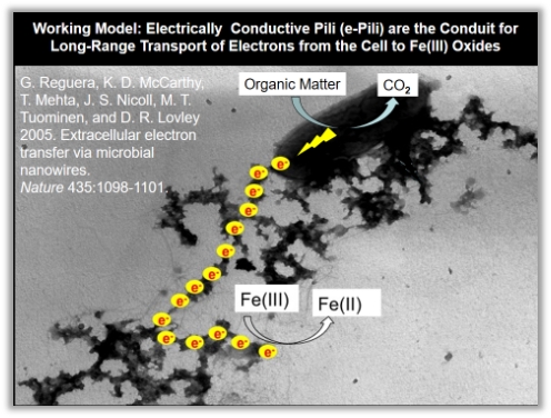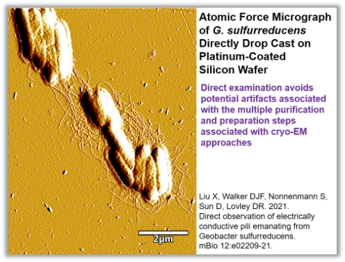 最近的冷冻电镜研究发现,这些导电纳米线还有可能是由膜外细胞色素OmcS、OmcZ、OmcE构成的;Derek Lovley教授也指出现存的几点争议:细胞色素构成的纳米线是G. sulfurreducens纳米线的主导吗;细胞色素型纳米线在长距离胞外电子传递中发挥重要作用;Pili甚至没有组装到这些纳米导线中。随后,Derek Lovley教授列举了最近的研究,主要通过比较野生型G. sulfurreducens,以及突变型G. sulfurreducens Aro5(其中pilA中一个芳香氨基酸被替换)产生的纳米线的导电差异,证明芳香族氨基酸在pili的导电特性中发挥重要作用;并通过AFM的测试,发现pili的直径为3nm,而细胞色素型纳米线直径为4nm,胞外存在大量直径为3nm的纳米导线,说明了pili的确组装成了纳米线,并且这些3nm的pili型纳米线比4nm的导电性能更高。然而这一争议仍在继续,需要更清晰的证据进一步证明。