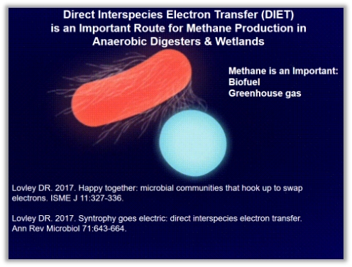 这之后,Derek Lovley教授实验室发现了另一类值得被关注的种间直接电子传递现象,即Geobacter与产甲烷菌之间的互营,实验发现,Geobacter metalireducens可以与多种产甲烷菌进行DIET,而Geobacter metalireducens的突变株Aro-5与产甲烷菌共培时,无法产生甲烷。通过AFM的测试,发现一些产甲烷菌的菌毛也具有一定的导电性。但产甲烷古菌的菌毛的具体作用仍待进一步揭示。