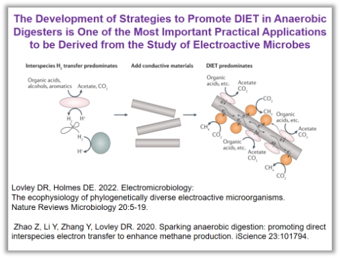 当在电活性菌与产甲烷古菌的DIET系统中加入导电材料时,例如生物炭等,发现,此时产甲烷效能显著增加;随后大量的相关应用类研究涌现,在厌氧系统中加入各类型导电材料后,通过增强电活性菌与产甲烷菌之间的DIET,进而增强甲烷的产生,这一过程现在仍为研究的热点,这是基于胞外电子传递理论的一项重大应用。