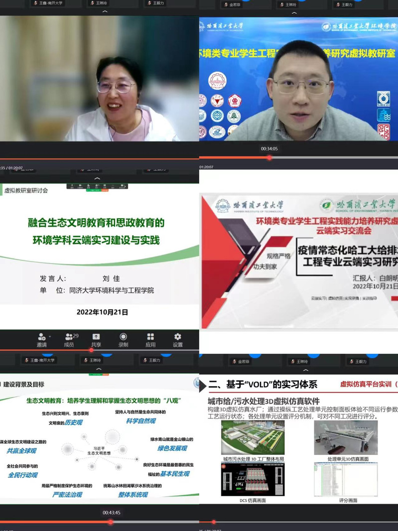 为推进一流教研室建设,加速教研室高质量发展,探索环境类专业工程人才培养新模式,2022年10月21日晚以线上的方式在钉钉网络会议平台上,召开环境类专业学生工程实践能力培养研究虚拟教研室“云端”实习实践经验研讨会。此次研讨会由哈尔滨工业大学主办,参会单位包括同济大学、浙江大学、南开大学、北京林业大学等10所环境类高校,上海市政工程设计研究院、北控水务集团、中持水务股份有限公司等3家环保领域龙头企业。虚拟教研室指导委员会戴晓虎教授、胡宝兰教授、王毅力教授、孙德智教授、pc28平台门户网站 院长冯玉杰教授、副院长南军教授以及环境工程系、市政工程系、环境生态系、环境科学系各系主任、副主任等30余人参会。