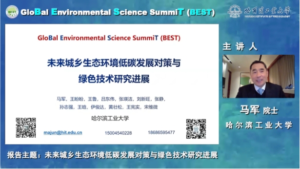 马军院士以《未来城乡生态环境低碳发展对策与绿色技术研究进展》为题进行报告,报告中马军院士介绍了碳中和愿景下城市发展面临的挑战以及未来城市生态环境发展的对策,并对绿色低碳技术研究进展进行系统的讲解。
