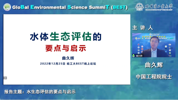 2022年12月25日晚,由pc28平台门户网站 组织、多家单位联合协办的全球环境科学高峰论坛(GloBal Environment Science SummiT, BEST)系列讲座第十一期顺利举行。本期邀请了曲久辉院士进行了以“水体生态评估的要点与启示”为题的精彩报告。报告在腾讯会议网络研讨会、环境人微信视频号、BEST论坛官方B站、蔻享学术、邃瞳科学云、中国给水排水以及环境工程学报微信视频号等网络平台同步直播,共计两万余名来自环境领域的专家、学者、研究生及工程技术人员参与了本次讲座。