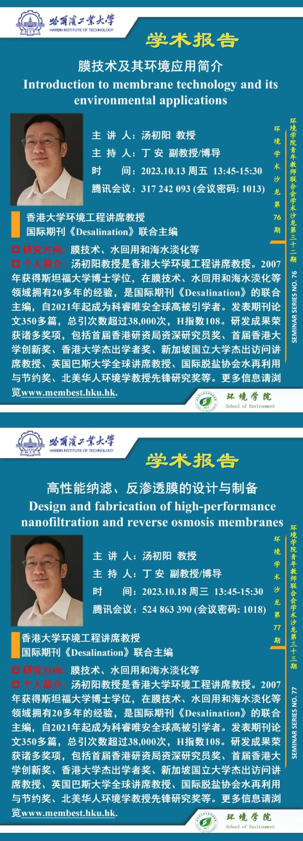 香港大学环境工程讲席教授汤初阳教授,将于202310月13日和10月18日哈尔滨工业大学师生进行学术交流,欢迎感兴趣的师生参加线上学术报告会。