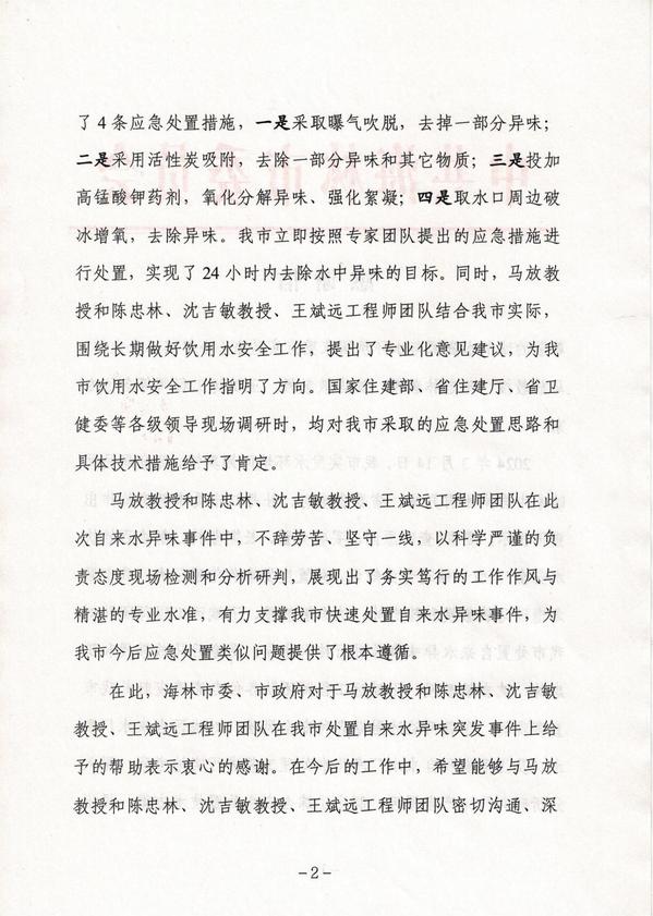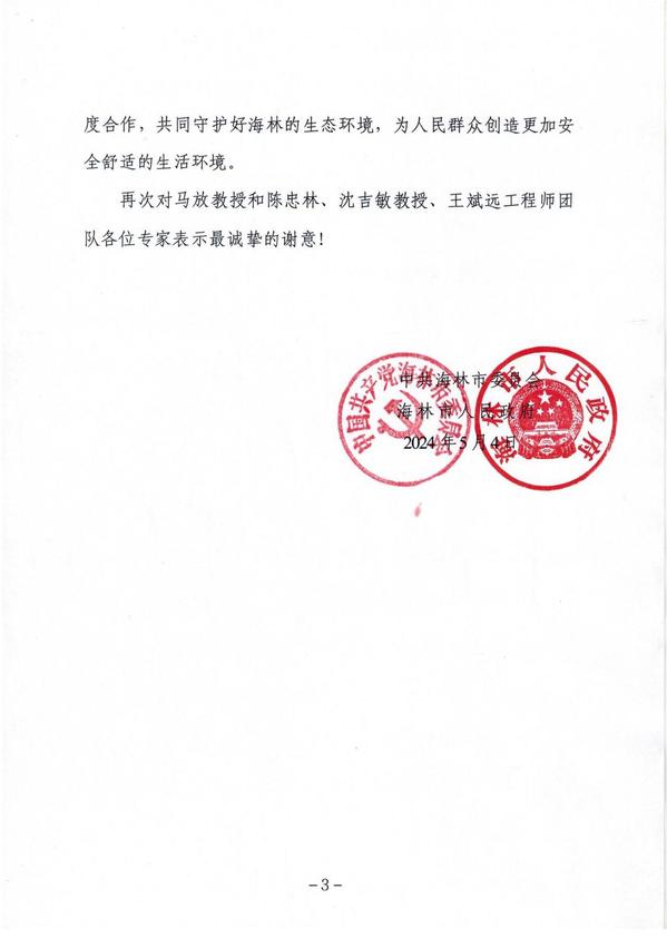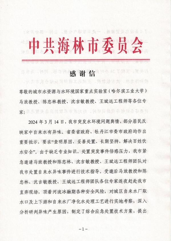 近日,pc28平台门户网站 教师收到了一封来自海林市委、市政府的感谢信,信中表达了对城市水资源与水环境国家重点实验室马放教授、陈忠林教授、沈吉敏教授、王斌远工程师等各位专家的诚挚感谢。